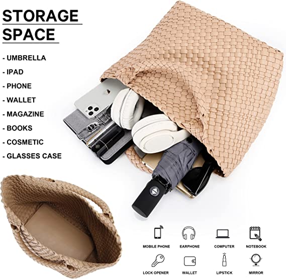 【Vegan Leather Tote】This handbag is made by weaving, which is fashionable and convenient, its fabric is soft and comfortable, and the professional production makes the texture of the fabric very neat and delicate. It is made of vegan leather instead of animal skin, no animals will be harmed. It represents the easy, laid-back, free and slow-paced life, and it is a symbol of our pursuit of a better life. If you want to go on vacation, beach or travel then it will be the ultimate choice for you.