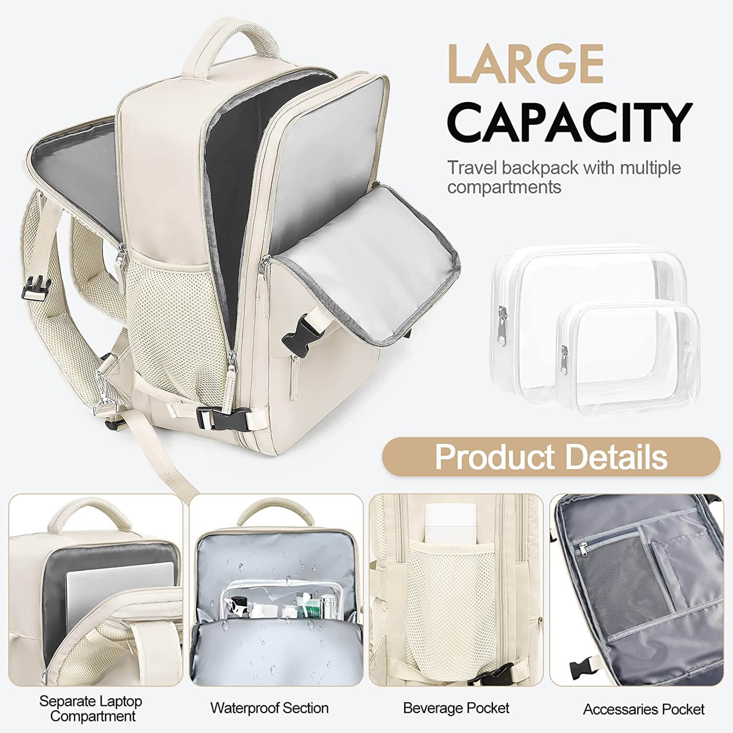 【Large Capacity and Multi Pockets】Stylish backpack with large storage capacity and two free two toiletry bags. Multiple zippered pockets give you plenty of storage space, including a front pocket, waterproof section, main compartment, separate laptop compartment, and anti-theft pocket on the back. In addition, this rucksack also has a mesh slip-in pocket with elastic closure on the left side for a bottle or an umbrella.