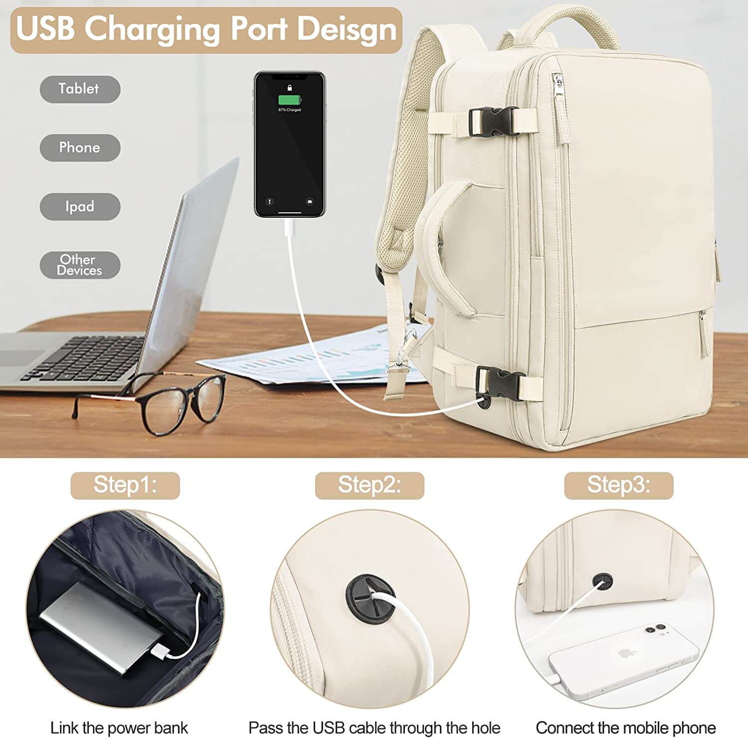 【Multipurpose and Convenient Design】The casual daypack features a side carry handle that allows you to effortlessly transform the backpack into a handbag whilst concealing the shoulder straps. This practical design reduces the backpack's space occupancy while enhancing its appearance. Furthermore, the backpack is equipped with a charging port design, making it ideal for outdoor activities, enabling you to conveniently charge your electronic devices while on-the-go.